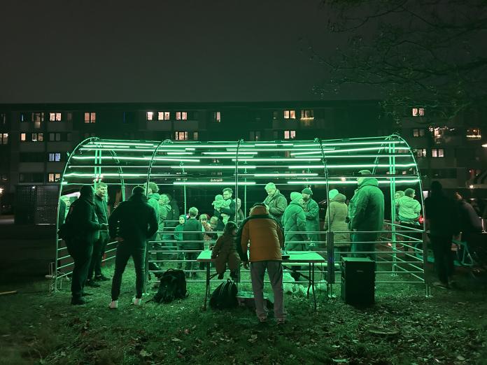 Fra slutningen af 2025 og videre ind i 2026 afprøver vi forskellige tiltag i byrummet. Første afprøvning er lysinstallationen ’A Shelter in Hyperspace’ af lyskunstnerne OnoMato og Diktakrom, der rejser sig som en passage imellem Hørgården og Sundholm på Amager og skaber en ny fysisk og visuel forbindelse og kobling herimellem. Den blev indviet i december og vil frem til marts 2026 sprede lys og liv. Lysinstallationen signalerer en start på en række midlertidige afprøvninger, som vi sammen med beboere og lokale aktører sætter i gang i 2026.